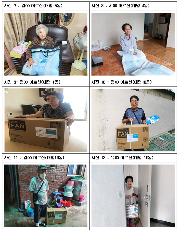 가. 내 용 : 재가노인지원서비스 어르신 혹서기 물품지원 나. 지원일시 : 2020. 7. 06(월) ~ 8. 14(금) 다. 지원물품 : 여름이불/선풍기/후원물품(생필품) 키트 ※후원물품키트 구성 : 비비고 소고기미역국 2봉, 비비고 된장찌개 2봉, 생강차 및 쌍화차 각 1봉씩 소포장, 치약 2개, 심야포차국수 1개, 아리따운물품 려샴푸 1개, 간장 1병, 손소독제 1병, 아이깨끗해 손세정제 1통, 일회용마스크 20매 라. 지원대상 : 재가노인지원서비스대상자 강동원 외 177명(총 178명) 마. 구 입 처 : 동화침장(☎ 053-562-4022 주소 : 대구 서구 와룡로 66길 9) 바. 지원방법 : 담당 사회복지사가 어르신 각 가정을 직접 방문‧전달