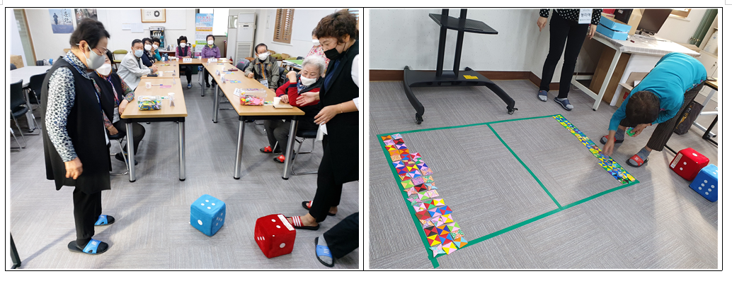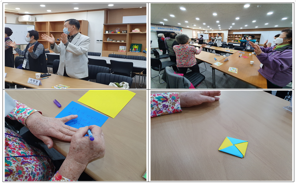 참 좋은 노인복지센터에서는 재가어르신들의 즐겁고 행복한 문화여가생활을 위하여 뇌인지 문화여가프로그램 4회 전래놀이를 실시하였습니다. ◆ 장 소 : 참좋은 노인복지센터 프로그램실 ◆ 시 간 : 2020.10.28.(수) 14:00~15:00 ◆ 프로그램명 : 뇌인지 문화여가 프로그램 (4회 절래놀이) ◆ 참 석 자 : 재가지원어르신 11명 ◆ 내 용 : 냄비박수‧소망딱지 만들기‧딱지 땅따먹기 게임을 통해 대소근육 운동과 협응력 향상