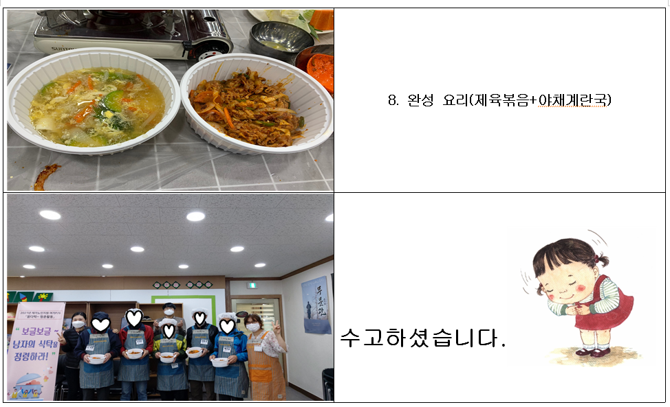 독거 남자어르신들을위한 “보글보글 ~ 남자의 식탁을 점령하라” 여가P/G 2회차를 실시하였습니다.