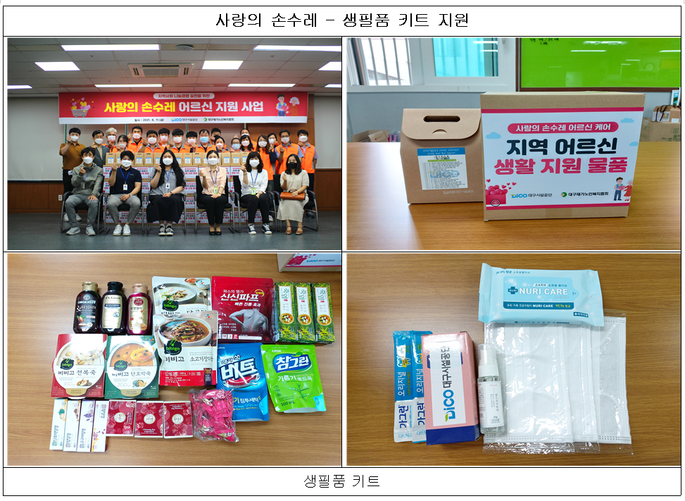 ◆ 지원물품 : 죽(비비고 전북죽, 단호박죽), 국(비비고 소고기 장터, 닭곰탕), 사탕, 양갱, 파스, 치약, 세제, 주방세제, 비누, 마스크, 손소독제, 물티슈, 가그린 외